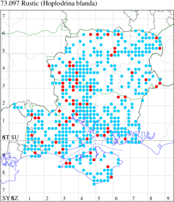 Common in a wide range of habitats, mainly in low-lying areas, including woodland, rough meadows and gardens throughout the British Isles, a species of conservation concern under the UK Biodiversity Action Plan. Common and well distributed in Hampshire and on the Isle of Wight. Wingspan 31-33 mm. Easily and frequently confused with Uncertain H. octogenaria, but generally H. blanda has a straighter costa, less rounded dorsum, smoother, more grey-brown forewing, stigmata less contrasting with remainder of forewing and slightly smaller. The Uncertain has broader wings, and is ochreous brown and coarser looking, with more obvious cross-lines, more contrasting stigmata, and a larger orbicular stigma. The Rustic has greyer and glossier in The Rustic, and appears later than The Uncertain, appearing towards the end of June, with the latter species appearing from late May. See the comparison photo in the collection above.