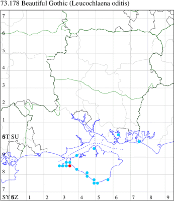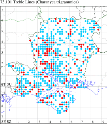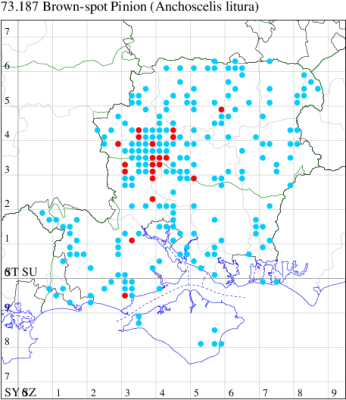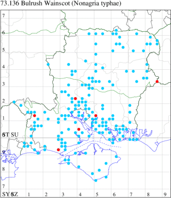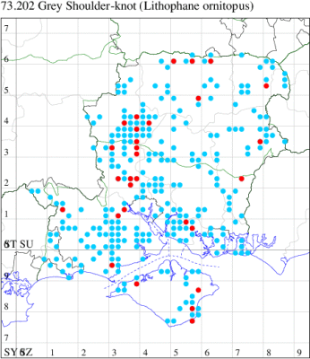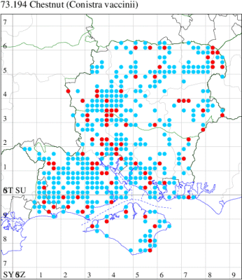 VC11: Furzehill, NF, one, 08 Sep (SLoa); West Wellow, one, 26 Sep (CNB); Marchwood, one, 01 Oct (TDCh); one, 08 Sep; one, 23 Sep; one, 25 Sep; two, 27 Sep; one, 29 Sep; one, 01 Oct; one, 03 Oct; one, 09 Oct; one, 12 Oct; one, 15 Oct (CTha); Woodlands, NF, present, 13 Oct (RBW); Ashurst, NF, one, 07 Oct (SAB); Totton, one, 24 Sep; one, 02 Oct (CNB); one, 08 Oct; one, 10 Oct (LHan); Lee, nr Nursling, two, 25 Sep (CTha); Ashley, one, 08 Oct (GCE); Romsey, one, 16 Sep (NRJ); Ashley, one, 08 Oct; one, 08 Oct; one, 08 Oct; Winter Down Copse, Little Somborne, one, 07 Oct; two, 07 Oct; one, 07 Oct; five, 07 Oct; Crawley, two, 14 Sep; one, 09 Oct (GCE); Chandlers Ford, one, 07 Oct (AMur); Allbrook, one, 12 Sep; one, 09 Oct; one, 13 Oct (SIng); Botley Wood, one, 22 Oct (RJD, MLO, ADT, DWal, KJW); Fareham, one, 25 Sep; two, 08 Oct (ADT); one, 07 Oct; one, 10 Oct; two, 12 Oct; one, 13 Oct; one, 14 Oct (MLO); one, to light, 07 Oct; one, to light, 08 Oct (KJW); Portsmouth, one, 23 Oct; one, 24 Oct (IRT); Hurn, two, 07 Oct (MJef); Thorney Hill, Bransgore, one, 06 Oct; one, 12 Oct (JFen); Sway, present, 03 Oct (DMui); Pennington, one, 06 Oct; one, 13 Oct; one, 15 Oct (RFC);