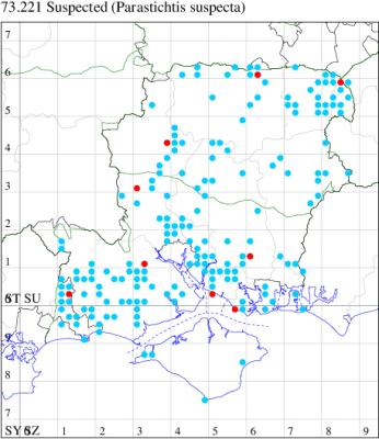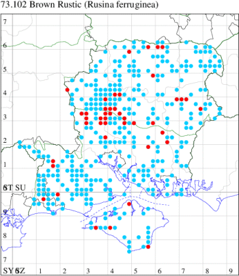 For the maps, all records prior to 2021 are shown by a blue dot (the larger the dot, the more recent), with the current year's records shown in red. As previous records are superimposed on any report for 2021, new sites have greater emphasis (i.e. will show as 'more red').