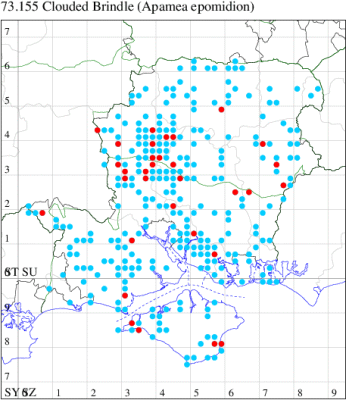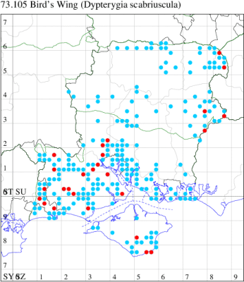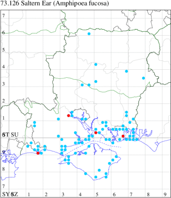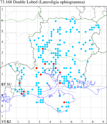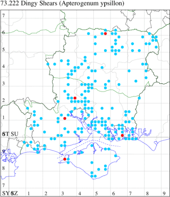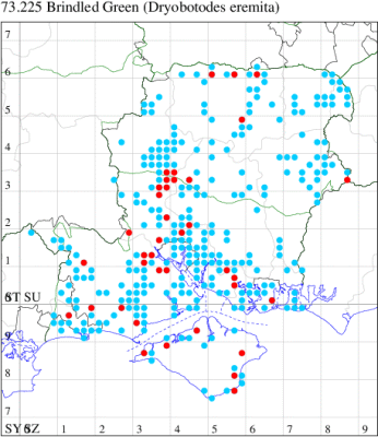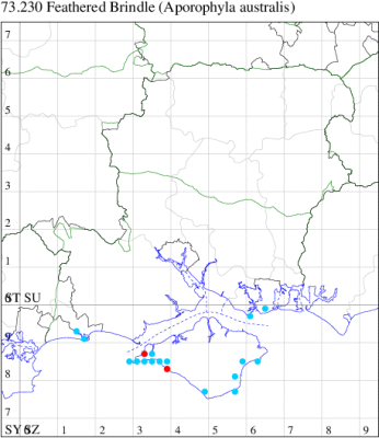 VC11: Ashley Heath, one, 16 Jul (SDut); Woodlands, NF, present, 28 Jul (RBW); Broughton, one, 25 Jul (GCE); Brownwich cliffs, one, 16 Jul (MLO, RJD, KJW); Wickham, one, 07 Jul; one, 09 Jul (JRDS); West Walk, five, 23 Jul (RJD, MLO, ADT, DWal, KJW); Browndown Coastal Ranges, one, 20 Aug (RJD, MLO, DWal, KJW);