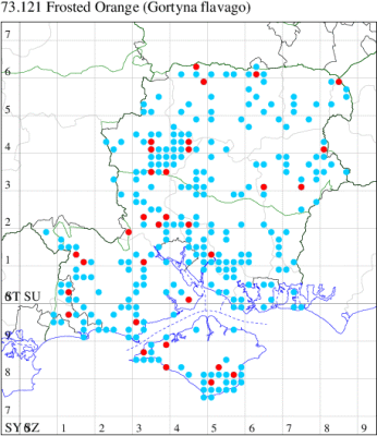 For species seen in 2021 that had less than or equal to 100 records, full details are included; for more common species, the earliest, latest and highest count by vice-county are shown. The narrative for each species is taken from the main Hantsmoths website, and it is possible that some information on abundance and occurrence can get out of date, as it is impossible to keep up with all changes; however it should give a good introduction to each species. The tables in each species account summarise the previous status, and that for the current year.