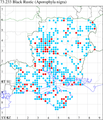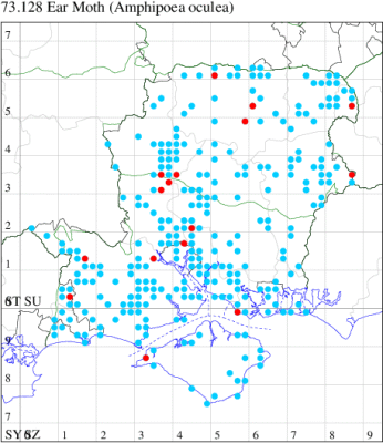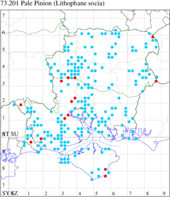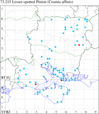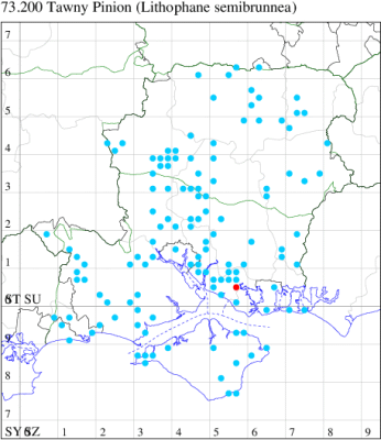 VC11: Fordingbridge, one, 02 Oct; two, 08 Oct (SCT); Furzehill, NF, three, 25 Sep (SLoa); West Wellow, one, 26 Sep (CNB); Marchwood, one, 25 Sep; one, 01 Oct; one, 05 Oct (CTha); Woodlands, NF, present, 06 Oct (RBW); Lee, nr Nursling, one, 09 Oct; one, 15 Oct; one, 23 Oct (CTha); Romsey, two, 21 Sep; one, 22 Sep; one, 24 Sep; two, 25 Sep; three, 03 Oct; two, 06 Oct; three, 08 Oct; one, 10 Oct; one, 11 Oct; two, 13 Oct (NRJ); #N/Aone, 24 Sep; three, 08 Oct (JRM); Allbrook, one, 07 Oct; one, 13 Oct (SIng); Botley Wood, one, 15 Oct (RJD, MLO, DWal, KJW); Fareham, one, 16 Oct (MLO); one, to light, female, 25 Sep; one, to light, 13 Oct (KJW); Botley, two, 24 Sep; one, 05 Oct; one, 15 Oct; one, 19 Oct; one, 23 Sep; one, 26 Sep; one, 28 Sep; one, 08 Oct; two, 12 Oct; one, 15 Oct (SLB); Portsmouth, one, 28 Sep; two, 07 Oct (IRT); Hurn, one, 07 Oct; two, 08 Oct; two, 16 Oct; four, 18 Oct; one, 19 Oct (MJef); Burton, nr Christchurch, one, 01 Oct (JStw); Milford on Sea, one, 22 Oct (MMcM); Pennington, one, 03 Sep; one, 20 Sep; one, 01 Oct; one, 06 Oct; two, 07 Oct; one, 08 Oct; two, 13 Oct; one, 17 Oct (RFC); Browndown Coastal Ranges, five, 4 males 1 female, 08 Oct (MLO, ADT, DWal, KJW);