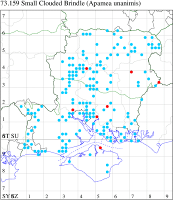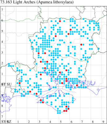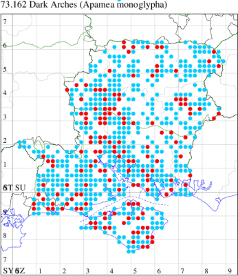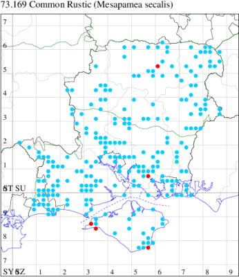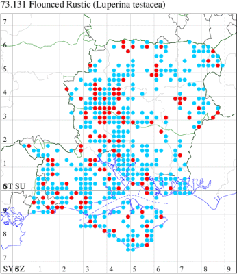 Following an expansion in range and numbers in recent decades, now common in grassland, heathland, woodland rides and gardens throughout southern England and Wales, north to southern Scotland. Widespread and common in Hampshire and on the Isle of Wight. Wingspan 27-34 mm. The main confusion species are Uncertain H. alsines and Rustic H. blanda, but less variable and often slightly smaller than these species, generally rather pale grey-brown, with relatively large orbicular and reniform stigmata, usually slightly darker than the ground colour, and usually distinctly white-edged. Larva feeds on various herbaceous plants, including Dandelion, Greater Plantain, Ribwort Plantain, Primrose and Prickly Lettuce.