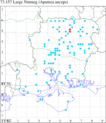 VC12: Little Somborne, one, 10 Oct; one, 10 Oct; Crawley, one, 14 Sep; one, 09 Oct; one, 10 Oct; one, 14 Sep; two, 09 Oct; two, 09 Oct; one, 10 Oct; one, 09 Oct; one, 07 Sep (GCE); Kempshott, one, 24 Sep; one, 08 Oct (GAH); Ecchinswell, one, 22 Sep; one, to a lighted window, 13 Oct (MJN); Axmansford, two, 14 Sep; four, 07 Oct; Great Haughurst Copse, Axmansford, one, 09 Oct (ACB); Pamber Forest, two, 24 Sep; two, 09 Oct (GJD); Hammer Vale, one, 25 Sep (ASwa)