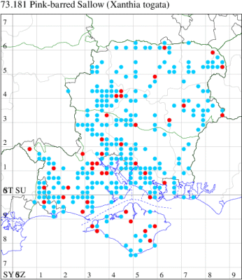 VC10: Totland, one, 26 Sep (RTer); Freshwater, one, 09 Sep; two, 15 Sep; one, 24 Sep; one, 08 Oct; one, 15 Oct; one, 16 Oct (DCoo); Brook, one, 25 Sep; one, 25 Sep; one, 01 Oct; one, 07 Oct (DWes & REJ)