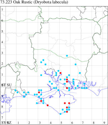 This species was found in Jersey in 1991 and is now established on Evergreen (Holm) Oak in the Channel Islands. First recorded in Britain at Freshwater, Isle of Wight, on 15 October 1999, and now annual in Freshwater and Ventnor in reasonable numbers, although only one confirmed larval record exists, from Fort Victoria in 2006; subsequently appearing in mainland Hampshire on 15 October 2005, and increasingly thereafter along the south coast: there have been two larval records to 2015. Wingspan 30-32 mm. The main confusion species are certain forms of Common Rustic Mesapamea secalis and Lesser Common Rustic Mesapamea didyma, but Oak Rustic usually has orange (occasionally white) reniform stigmata and flies very late in the season.