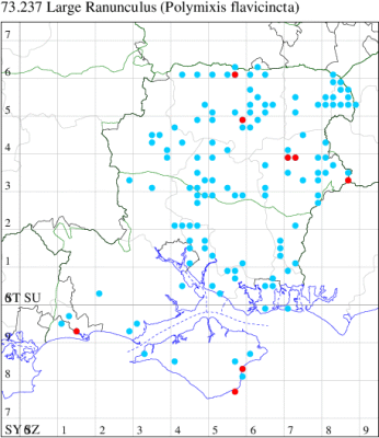 Local on sea cliffs, sand-dunes, shingle beaches and grassy slopes, on the coast of England and Wales. In Hampshire fairly common in the south and on the Isle of Wight, but very uncommon in the north. Wingspan 39-43 mm. Can only be confused with Black-banded P. xanthomista or Large Ranunculus P. flavicincta, which see. Larva feeds on Hound's-tongue, Sea Plantain, Thrift and Biting Stonecrop.