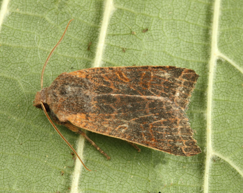 Local in fens, damp woodland, scrubby heathland and moorland throughout the British Isles. In Hampshire this species occurs in birch-heath country, mainly in the New Forest and the north-east. There are two records from the Isle of Wight, one very old. Wingspan 29-34 mm. Easily overlooked amongst the far more numerous rustic and minor species of high summer, but candidates can usually be picked out from these on the basis of size and wing-shape — look for a slightly arched costa, rounded termen, and somewhat pointed apex — rather variable in colour and intensity of markings, but often variable shades of red, with finely white-edged reniform and orbicular stigmata, and dentate black cross-lines often reduced or faint. Larva feeds on Silver and Downy Birch, and Sallow, over-wintering as an egg.
