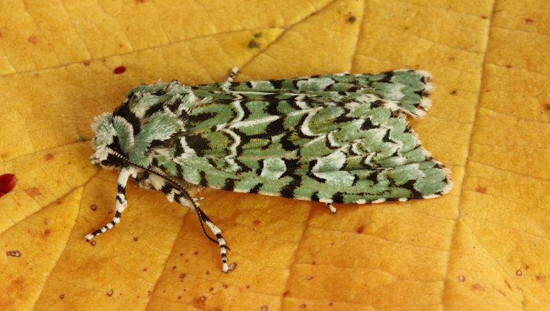 Very rare immigrant from southern Europe, appearing in Guernsey at Icart Point on 3 October 2006, since when it has become quite regular there. Recorded for the first time on mainland Britain at Durlston CP, Dorset, on 12 October 2008, with four at the same site between 29 September 2009 and 10 October 2009, suggesting that the species may be breeding locally. In Hampshire recorded for the first time at Sandy Point, Hayling, on 28 September 2010, the sixth British record, with two more records subsequently; on the Isle of Wight, it was first seen in 2012, and then underwent a remarkable transformation of status: after five in 2013, there have been multiple annual records, and it is almost certainly locally resident in the Bonchurch / Ventnor area. It may be locally established in Hayling Island / Portchester on the mainland: 2023 saw the first VC12 record with one way out of range in the Winchester area, which may have been a primary immigrant or dispersal from the coast. Wingspan 36-40 mm. Much darker and larger than Brindled Green D. eremita and appears very much later than Dark Brocade Blepharita adusta, from which distinguished by its generally smaller size, lack of white scaling in the reniform stigma, less angled forewing termen, and well-defined, curved postmedian line on the hindwing. Larva feeds on Evergreen Oak.