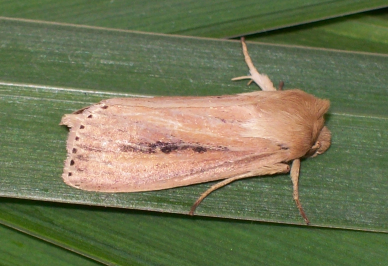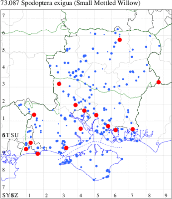 Common in grassland, farmland and gardens throughout the British Isles. Widespread and common in Hampshire and on the Isle of Wight. Wingspan 24-32 mm. Very variable in size, but easy to recognise by the series of four small dots along the costa of each forewing, the first, at about one quarter distance from the base of the wing, often the least obvious; one of a number of superficially similar, fairly nondescript moths, which are often difficult for beginners, Pale Mottled Willow is relatively common from spring to autumn, while Small Mottled Willow Spodoptera exigua and Dark Mottled Willow S. cilium are both migrants, and differ in the way in which they hold their wings at rest. Larva feeds on seeds of various grasses and cereal crops.