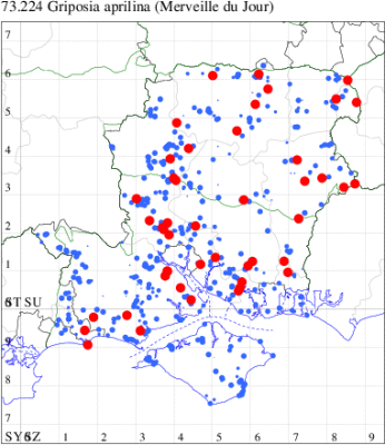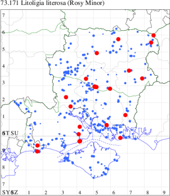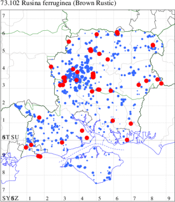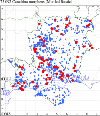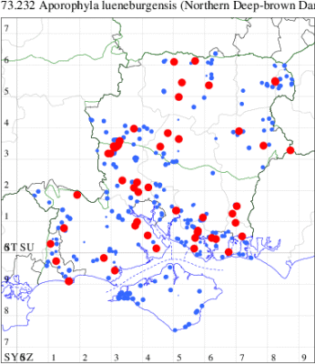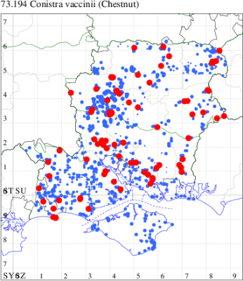 For the maps, all records prior to 2023 are shown by a blue dot (the larger the dot, the more recent), with the current year's records shown in red. As previous records are superimposed on any report for 2023, new sites have greater emphasis (i.e. will show as 'more red').