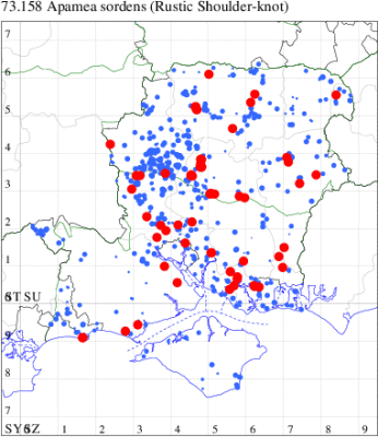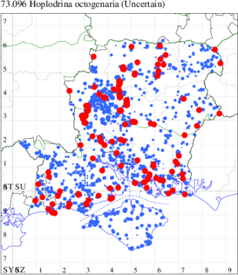 Common in a wide range of habitats, mainly in low-lying areas, including woodland, rough meadows and gardens throughout the British Isles. Widespread and common in Hampshire and on the Isle of Wight. Wingspan 31-33 mm. Easily and frequently confused with Rustic H. blanda, but generally H. octogenaria has broader and rougher forewing, stigmata contrasting with remainder of forewing, and more conspicuous cross-lines (MBGBI Vol 10). The general coloration of The Rustic is brown to grey with a glossy appearance, whereas The Uncertain is ochreous brown and coarser looking, and the orbicular stigma is usually smaller in The Rustic. The hindwings are greyer and glossier in The Rustic and the stigma smaller than The Uncertain. The Uncertain flies from late May, whereas The Rustic usually appears at the end of June. See the comparison photo in the collection above.