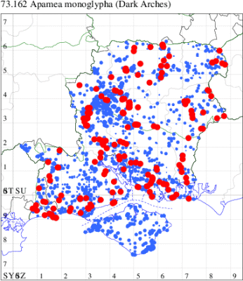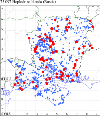 Common in a wide range of habitats, mainly in low-lying areas, including woodland, rough meadows and gardens throughout the British Isles, a species of conservation concern under the UK Biodiversity Action Plan. Common and well distributed in Hampshire and on the Isle of Wight. Wingspan 31-33 mm. Easily and frequently confused with Uncertain H. octogenaria, but generally H. blanda has a straighter costa, less rounded dorsum, smoother, more grey-brown forewing, stigmata less contrasting with remainder of forewing and slightly smaller. The Uncertain has broader wings, and is ochreous brown and coarser looking, with more obvious cross-lines, more contrasting stigmata, and a larger orbicular stigma. The Rustic has greyer and glossier in The Rustic, and appears later than The Uncertain, appearing towards the end of June, with the latter species appearing from late May. See the comparison photo in the collection above.