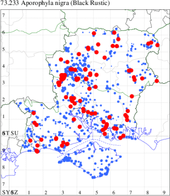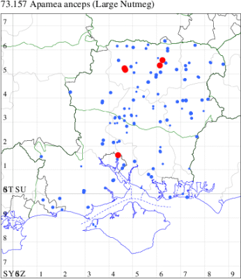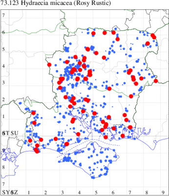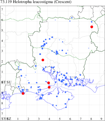 VC12: Nether Wallop, one, 30 Sep; Broughton, one, 05 Oct; Wherwell, one, 07 Sep; Chilbolton, one, 09 Sep; one, 18 Sep; one, 08 Oct (GCE); Grayshott, one, 01 Oct (THard); Lower Wyke Farm, St Mary Bourne, one, 07 Oct; Longparish, one, 13 Sep; Cole Henley, two, 12 Sep (GCE); North Waltham, one, 01 Sep; one, 04 Sep; two, 16 Sep; one, 25 Sep (AJon); Ecchinswell, one, 26 Sep (MJN); Great Haughurst Copse, Axmansford, one, 16 Sep; three, 30 Sep (ACB); Vyne Lodge Farm, Cufaude, two, 07 Sep; one, 14 Sep (AWan); Pamber Forest, one, 06 Sep; two, 12 Sep; three, 27 Sep (GJD); Alton, one, 26 Sep (DBO); Upper Farringdon, two, 10 Sep (CJP); Whitehill, two, 21 Sep; one, 26 Sep; three, 06 Oct; one, 09 Oct (ASto); Blacknest, Binstead, six, 08 Aug (MAng); Hammer Vale, Woolmer, one, 06 Sep; one, 16 Sep; two, 18 Sep; one, 23 Sep; one, 24 Sep; one, 26 Sep; one, 06 Oct (ASwa); Fleet Pond, one, 24 Sep; one, 01 Oct (MHals); Farnborough, one, 16 Sep (MThmp); Blackwater, one, 24 Sep (BGD)
