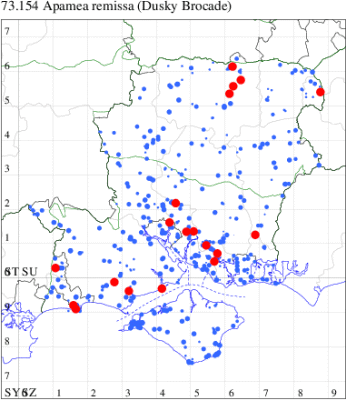 Following an expansion in range and numbers in recent decades, now common in grassland, heathland, woodland rides and gardens throughout southern England and Wales, north to southern Scotland. Widespread and common in Hampshire and on the Isle of Wight. Wingspan 27-34 mm. The main confusion species are Uncertain H. alsines and Rustic H. blanda, but less variable and often slightly smaller than these species, generally rather pale grey-brown, with relatively large orbicular and reniform stigmata, usually slightly darker than the ground colour, and usually distinctly white-edged. Larva feeds on various herbaceous plants, including Dandelion, Greater Plantain, Ribwort Plantain, Primrose and Prickly Lettuce.