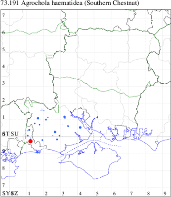Local in gardens, waste ground, damp meadows and rough ground throughout much of southern England and Wales. In Hampshire previously very local and by no means common, except in the Alton/Selborne area, but in recent years has become a relatively common autumn moth, perhaps indicating a recent range expansion and growth in population. On the Isle of Wight, remains extremely uncommon. Wingspan 42-52 mm. Larva feeds on Dandelion, Rosebay Willowherb, Red Valerian and Common Ragwort, over-wintering as an egg.