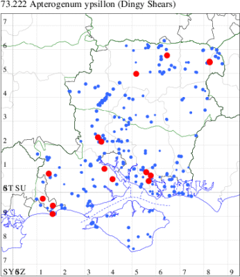 VC11: Earliest: Chandler's Ford, 16 Apr, 1 (KArb) Latest: Fareham, 19 Oct, 1 (KJW) Max count: Fareham, 12 Sep, 20 (KJW)