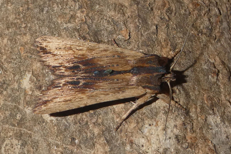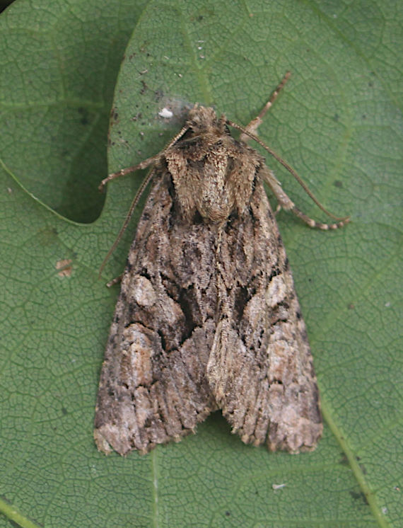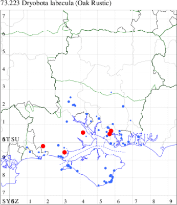 This species was found in Jersey in 1991 and is now established on Evergreen (Holm) Oak in the Channel Islands. First recorded in Britain at Freshwater, Isle of Wight, on 15 October 1999, and now annual in Freshwater and Ventnor in reasonable numbers, although only one confirmed larval record exists, from Fort Victoria in 2006; subsequently appearing in mainland Hampshire on 15 October 2005, and increasingly thereafter along the south coast: there have been two larval records to 2015. Wingspan 30-32 mm. The main confusion species are certain forms of Common Rustic Mesapamea secalis and Lesser Common Rustic Mesapamea didyma, but Oak Rustic usually has orange (occasionally white) reniform stigmata and flies very late in the season.