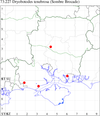Very rare immigrant from southern Europe, appearing in Guernsey at Icart Point on 3 October 2006, since when it has become quite regular there. Recorded for the first time on mainland Britain at Durlston CP, Dorset, on 12 October 2008, with four at the same site between 29 September 2009 and 10 October 2009, suggesting that the species may be breeding locally. In Hampshire recorded for the first time at Sandy Point, Hayling, on 28 September 2010, the sixth British record, with two more records subsequently; on the Isle of Wight, it was first seen in 2012, and then underwent a remarkable transformation of status: after five in 2013, there have been multiple annual records, and it is almost certainly locally resident in the Bonchurch / Ventnor area. It may be locally established in Hayling Island / Portchester on the mainland: 2023 saw the first VC12 record with one way out of range in the Winchester area, which may have been a primary immigrant or dispersal from the coast. Wingspan 36-40 mm. Much darker and larger than Brindled Green D. eremita and appears very much later than Dark Brocade Blepharita adusta, from which distinguished by its generally smaller size, lack of white scaling in the reniform stigma, less angled forewing termen, and well-defined, curved postmedian line on the hindwing. Larva feeds on Evergreen Oak.