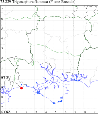 Local on sea cliffs, sand-dunes, shingle beaches and grassy slopes, on the coast of England and Wales. In Hampshire fairly common in the south and on the Isle of Wight, but very uncommon in the north. Wingspan 39-43 mm. Can only be confused with Black-banded P. xanthomista or Large Ranunculus P. flavicincta, which see. Larva feeds on Hound's-tongue, Sea Plantain, Thrift and Biting Stonecrop.
