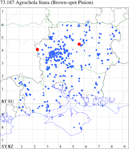 Nationally scarce (Nb) on shingle beaches, sand-dunes and sea cliffs, along the coasts of southern and south-eastern England from Cornwall to Suffolk and, locally, on the southern slopes of the South Downs. On the Isle of Wight, common on the Freshwater cliffs. In Hampshire there have been two records, at Southsea in September 1988, and Hengistbury Head (in the Dorset section of vice-county 11) in October 1996. Wingspan 36-42 mm. The dark form ingenua could be confused with Deep-brown Dart A. lutulenta, which flies at the same time, sometimes on the same ground, but in A. lutulenta the forewing is more ample, with pointed apex; the median fascia is darker than the adjacent areas and the fringe is not chequered (MBGBI Vol 10). Larva feeds on various herbaceous plants, including Sea Campion, Common Sorrel, Bramble and Wood Sage.