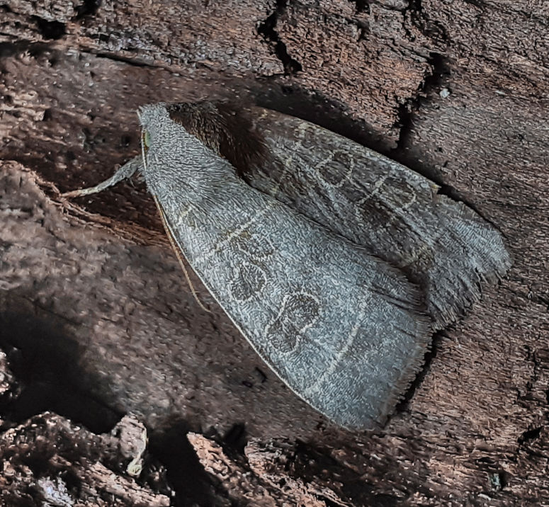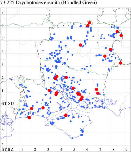 Very rare immigrant from southern Europe, appearing in Guernsey at Icart Point on 3 October 2006, since when it has become quite regular there. Recorded for the first time on mainland Britain at Durlston CP, Dorset, on 12 October 2008, with four at the same site between 29 September 2009 and 10 October 2009, suggesting that the species may be breeding locally. In Hampshire recorded for the first time at Sandy Point, Hayling, on 28 September 2010, the sixth British record, with two more records subsequently; on the Isle of Wight, it was first seen in 2012, and then underwent a remarkable transformation of status: after five in 2013, there have been multiple annual records, and it is almost certainly locally resident in the Bonchurch / Ventnor area. It may be locally established in Hayling Island / Portchester on the mainland: 2023 saw the first VC12 record with one way out of range in the Winchester area, which may have been a primary immigrant or dispersal from the coast. Wingspan 36-40 mm. Much darker and larger than Brindled Green D. eremita and appears very much later than Dark Brocade Blepharita adusta, from which distinguished by its generally smaller size, lack of white scaling in the reniform stigma, less angled forewing termen, and well-defined, curved postmedian line on the hindwing. Larva feeds on Evergreen Oak.