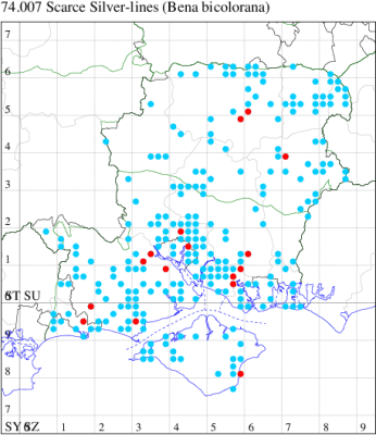 VC11: Brockenhurst, one, field observation, 04 Jul (PDB); Marchwood, two, 30 Jun (TDCh); Woodlands, NF, present, 16 Jul (RBW); Ashurst, one, 01 Jul (RFC); Totton, one, 13 Jul; one, 19 Jul; one, 20 Jul (LHan); East Tytherley, one, 14 Jul; one, 14 Jul (GCE); Romsey, one, 15 Jul (MBak); Kings Somborne, one, 12 Aug (GCE); Romsey, one, 27 Jun; one, 03 Jul (NRJ); Kings Somborne, three, 29 Jun; eight, 29 Jun; two, 29 Jun; one, 29 Jun; Broughton, one, 25 Jul; Ashley, one, 26 Jun; Winter Down Copse, Little Somborne, one, 19 Jul (GCE); Southampton, one, 20 Jul (MGP); Midanbury, Southampton, larva, one, field observation, 04 Nov (NBur); Allbrook, one, 08 Jul; one, 20 Jul (SIng); Wickham, one, to light, 09 Jul (KCok, RJD, MLO, ADT, KJW); Botley, one, 03 Jul (SLB); Wickham, one, 06 Jul; one, 18 Jul (JRDS); West Walk, one, 23 Jul (RJD, MLO, ADT, DWal, KJW); Hurn, one, 29 Jun (MJef); Setthorns Inclosure, NF, one, 22 Jun (PBar); Hordle, one, 18 Jul (DBoy); Pennington, one, 27 Jun (RFC);