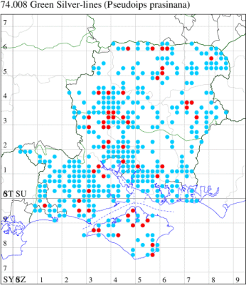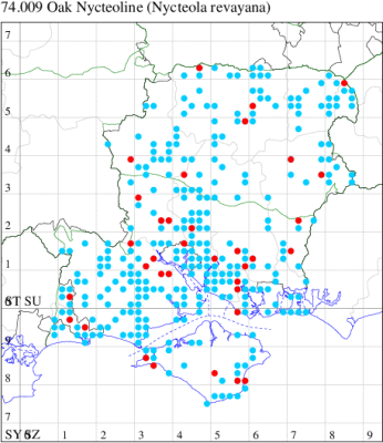 VC11: Ashley Heath, one, 16 Jul (SDut); Marchwood, one, 24 Mar; one, 12 Jul (TDCh); one, 19 Jul; one, 06 Sep (CTha); Woodlands, NF, present, 14 Jul (RBW); Totton, one, 16 Mar; one, 31 Mar; one, 01 Apr (LHan); East Tytherley, one, 14 Jul (GCE); Woodley, one, 09 Nov (NBin det. MJW); Romsey, one, 24 Feb (NRJ); Swaythling, Southampton, one, 02 Jul; one, 09 Jul; one, 20 Jul; one, 27 Jul (MEdg); Allbrook, one, 04 Sep; one, 05 Sep; one, 06 Sep; one, 08 Oct (SIng); Fareham, one, 24 Feb (ADT); one, 21 Jul; one, 23 Sep (IMcP); two, 11 Jul; one, to light, 31 Jul (KJW); Botley, one, 24 Feb; one, 24 Feb; one, 18 Jul (SLB); Shirrell Heath, one, 20 Apr (LEdg); Wickham Common, one, 28 May (KCok, RJD, MLO, DWal det. RJD); Wickham, one, 19 Jul (JRDS); West Walk, one, 24 Sep (RJD, MLO, ADT, KJW); Horndean, one, 20 Feb (PHog); Petersfield, one, 09 Apr (RAll); Hurn, one, 07 Oct (MJef); Burton, nr Christchurch, one, 16 Jul (JStw); Browndown Coastal Ranges, two, 08 Oct (MLO, ADT, DWal, KJW);