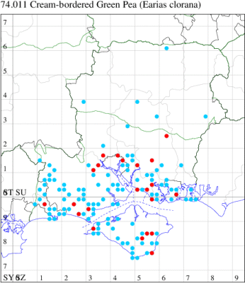 Nationally scarce (Nb) in fens, damp woodland, heathland and mosses throughout much of south-eastern England; widespread in south Hampshire and on the Isle of Wight, but very uncommon in north Hampshire, where presumably all records relate to wanderers from the south of the county - 2023 saw for records, the most ever, which may presage a range expansion. Wingspan 20-24 mm. The superficially similar Green Oak Tortrix Tortrix viridana has grey hindwing and lacks the white costal streak of Cream-bordered Green Pea; two very rare immigrants, Spiny Bollworm E. biplaga and Egyptian Bollworm E. insulana, may also occur. Larva feeds on terminal shoots of Osier, Creeping Willow, and other species of Salix, over-wintering as a pupa.