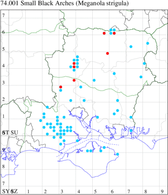 Nationally scarce (Na) in oak woodland in southern England. In Hampshire and on the Isle of Wight moderately common in the large oak woods - Parkhurst Forest, the New Forest, Harewood and Pamber Forests; very occasional elsewhere. Wingspan 18-24 mm. Similar to Least Black Arches N. confusalis, but Small Black Arches lacks the prominent dentations on the median fascia of forewing (MBGBI Vol 9). Larva feeds on Pedunculate Oak.