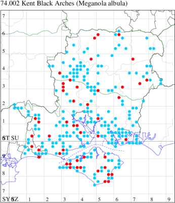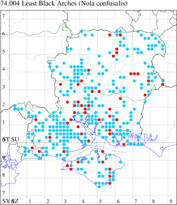 Nationally scarce (Nb) on heathland, saltmarshes, shingle beaches, sandy beaches, chalk downland and woodland clearings, in south-eastern England, predominantly coastal, but increasing in recent years inland in central southern England. In Hampshire and on the Isle of Wight widespread but uncommon near the coasts of vice-counties 10 and 11, becoming rather more common in vice-county 12 in recent years. There was a marked increase in the number of records received in 2009. Wingspan 18-24 mm. The most likely confusion species is Scarce Black Arches Nola aerugula. Larva feeds on Dewberry, Bramble, Raspberry and Wild Strawberry.