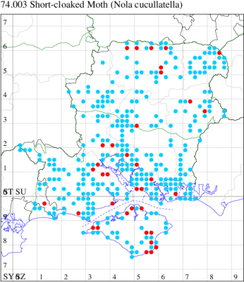 Common in hedgerows, gardens, scrub and woodland throughout much of Britain. In Hampshire and on the Isle of Wight still widespread and fairly common in all three vice-counties. Wingspan 15-20 mm. The easiest of the Nolidae to identify, and one of the most common. Larva feeds on Hawthorn, Midland Hawthorn, Blackthorn, Apple, Pear and Plum.