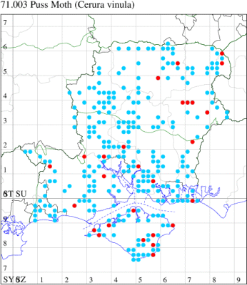 Common in gardens, hedgerows, open woodland, moorland and scrub, throughout the British Isles, but rare at high altitude. In Hampshire and on the Isle of Wight, widespread, but seen only in small numbers. Wingspan 62-80mm. Amongst resident species, unmistakable, although the very similar Feline Cerura erminea has been recorded twice on the Channel Islands. Larva feeds on Black Poplar, White Poplar, Aspen and Goat Willow, over-wintering as a pupa.