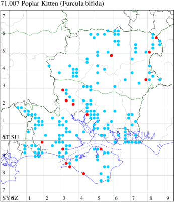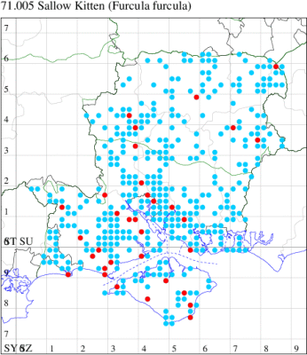 Common in woodland rides and clearings, hedgerows, parks, moorland, heathland and gardens throughout the British Isles. Widespread and common in Hampshire and on the Isle of Wight. Wingspan 35-42 mm. The main confusion species is Poplar Kitten F. bifida, but F. furcula is smaller and outer edge of central cross-band is usually rather irregular and usually only finely outlined in black in the leading half, while in F. bifida the outer margin of the median fascia is black and more evenly curved (MBGBI Vol 9). Larva feeds on Grey, Goat and White Willow, White and Black Poplar, and Aspen, over-wintering as a pupa.