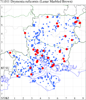 Common in oak woodland throughout much of England and Wales, and parts of Scotland. In Hampshire and on the Isle of Wight still locally common in the New Forest and the north-east, but has declined markedly from the middle of the 20th Century. Wingspan 39-44 mm. The main confusion species is Lunar Marbled Brown D. ruficornis, which see. Larva feeds on Oak, over-wintering as a pupa.