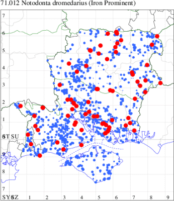 Common in woodland, hedgerows and gardens throughout the British Isles. Widespread and common in Hampshire and on the Isle of Wight. Wingspan 42-52 mm. Could be confused with the very rare immigrant Three-humped Prominent N. tritophus, which see. Larva feeds on Sallow and Willow, over-wintering as a pupa.