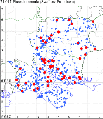 Common in woodland, plantations, scrub, gardens and parks throughout the British Isles. Widespread and common in Hampshire and on the Isle of Wight. Wingspan 50-64 mm. The main confusion species is Lesser Swallow Prominent P. gnoma, in which the thin white tornal line of Swallow Prominent is replaced by a very distinct white, wedge-shaped dash. Larva feeds on Aspen, Poplar, Willow and Sallow, over-wintering as a pupa.