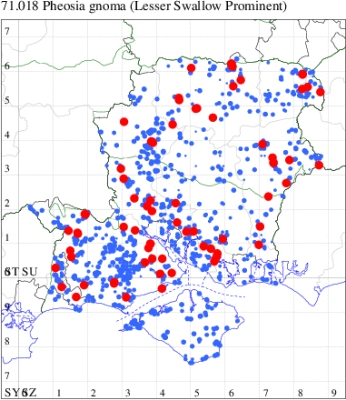 Common in woodland, heathland, moorland, downland, parks and gardens throughout the British Isles. Widespread and common in Hampshire and on the Isle of Wight. Wingspan 46-58 mm. The main confusion species is Swallow Prominent P. tremula, in which the very distinct white, wedge-shaped tornal dash of Lesser Swallow Prominent is replaced by a thin white line. Larva feeds on Silver and Downy Birch, over-wintering as a pupa.