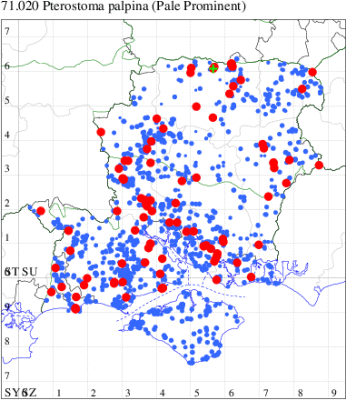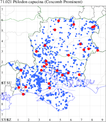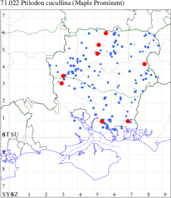 Local in broad-leaved woodland, scrub, hedgerows and gardens throughout much of south-eastern England. A moth with a curious distribution in our area, completely absent from the New Forest and the Isle of Wight but thinly distributed from the south-east of Hampshire up to the north and north-east. Wingspan 37-46 mm. The most likely confusion species is Coxcomb Prominent P. capucina, which see for differences. Larva feeds on Field Maple, mainly on young trees, over-wintering as a pupa.
