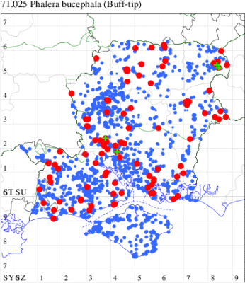 For the maps, all records prior to 2023 are shown by a blue dot (the larger the dot, the more recent), with the current year's records shown in red. As previous records are superimposed on any report for 2023, new sites have greater emphasis (i.e. will show as 'more red').