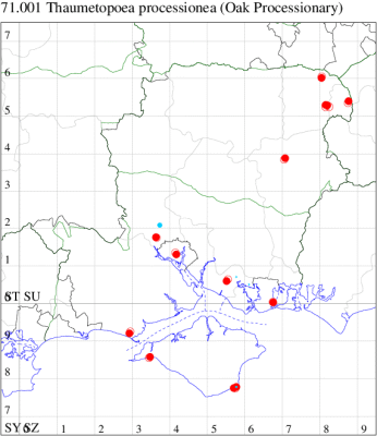 Rare immigrant from mainland Europe, appearing in southern England. It is expanding its range on the continent and is resident on the Channel Islands, and likely to be reported with increased frequency. While the Moths of Hampshire and Isle of Wight (Goater & Norriss, 2001) states "15 or so records of this species (all males), since the first in 1983" this account must be erroneous as the relevant atlas map shows no dots for the county and there are no reports on the county database from mainland Hampshire before two on consecutive days in mid-2004. On the Isle of Wight, reported for the first time in September 1998. The year 2020 saw a considerable increase in numbers and expansion of range, particularly into the north-east of Hampshire and Isle of Wight, with at least 26 individuals being reported. Wingspan male 31-35 mm, female 36-41 mm. Similar to Pine Processionary T. pityocampa, but has smaller and weaker comma-shaped marking in the centre of the forewing. Larva feeds on Sessile Oak, Pedunculate Oak, Turkey Oak and Evergreen Oak, living gregariously within a silken web.