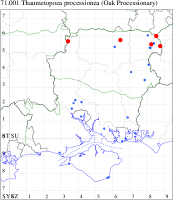 Rare immigrant from mainland Europe, appearing in southern England. It is expanding its range on the continent and is resident on the Channel Islands, and likely to be reported with increased frequency. While the Moths of Hampshire and Isle of Wight (Goater & Norriss, 2001) states "15 or so records of this species (all males), since the first in 1983" this account must be erroneous as the relevant atlas map shows no dots for the county and there are no reports on the county database from mainland Hampshire before two on consecutive days in mid-2004. On the Isle of Wight, reported for the first time in September 1998. The year 2020 saw a considerable increase in numbers and expansion of range, particularly into the north-east of Hampshire and Isle of Wight, with at least 26 individuals being reported. Wingspan male 31-35 mm, female 36-41 mm. Similar to Pine Processionary T. pityocampa, but has smaller and weaker comma-shaped marking in the centre of the forewing. Larva feeds on Sessile Oak, Pedunculate Oak, Turkey Oak and Evergreen Oak, living gregariously within a silken web.