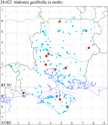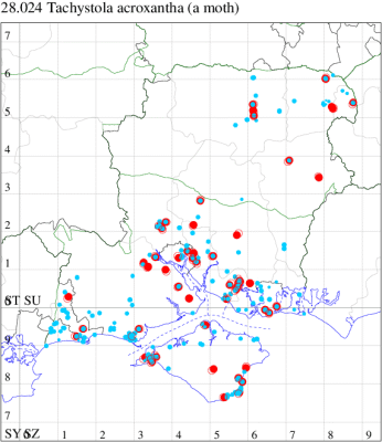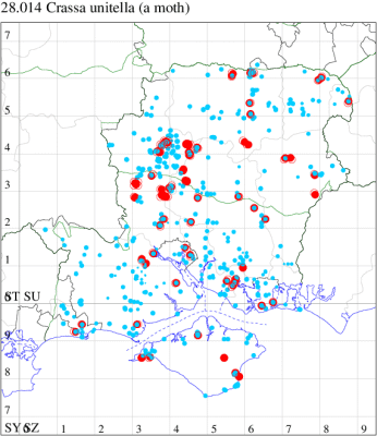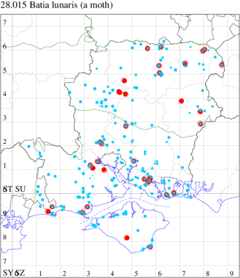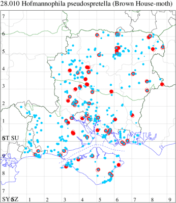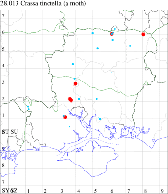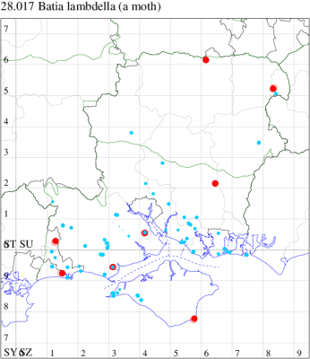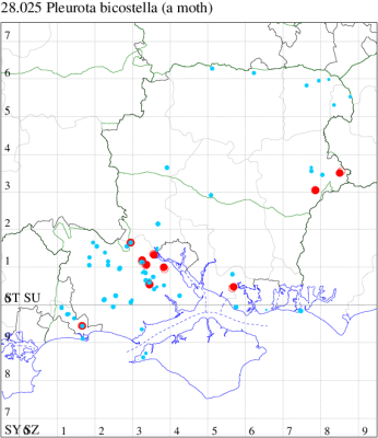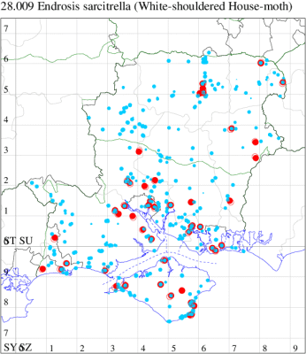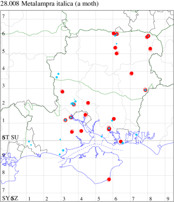 VC11: Pig Bush, NF*, one, 17 Jul (CL); Woodlands, New Forest, present, 10 Aug (RBW); Totton, one, 27 May; two, 12 Jun; one, 11 Aug (LH); East Tytherley, one, to actinic, 10 Aug (GCE); Romsey, one, 16 Jul; one, 06 Aug; one, 16 Aug (MB); Dibden Purlieu*, one, to actinic, 17 Aug (RAC); Southampton*, one, to actinic, 01 Jul (MGP det. MJW); Eastleigh*, one, to actinic, 02 Jul; one, to actinic, 07 Aug; one, to actinic, 26 Aug; one, to actinic, 08 Sep (KArb); Allbrook*, one, to actinic, 12 Aug; one, to actinic, 14 Aug (SI); Fareham, one, to actinic, 09 Aug; one, to actinic, 23 Aug (MLO); one, 04 Jun; one, field observation, 06 Jun; one, 08 Jun; one, 09 Jun; one, 11 Jun; one, field observation, 13 Jun; one, field observation, 14 Jun; three, 25 Jun; one, 26 Jun; one, 11 Aug; one, 14 Aug (KJW); one, in flight, flying by day close to ground level at base of pellitory-of-the-wall, 04 Jul (RJD); Wickham, three, 08 Aug (JRDS); West Walk*, three, 14 Aug (F.M.G.); Southsea, one, 02 Jun; one, 08 Jun; one, 29 Jun; one, 28 Jul (JGe);