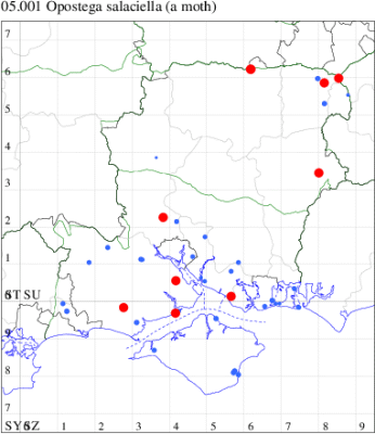 Local on heathland, dry pastures and other open areas throughout much of the British Isles. In Hampshire and on the Isle of Wight restricted to a handful of sites, mostly on Portsea and Hayling Islands, but also at Leckford, Wickham Common and in the Hook Valley. Wingspan 9-12 mm. Imago is the whitest of the Opostegidae. Larva mines leaves of Sheep's Sorrel.