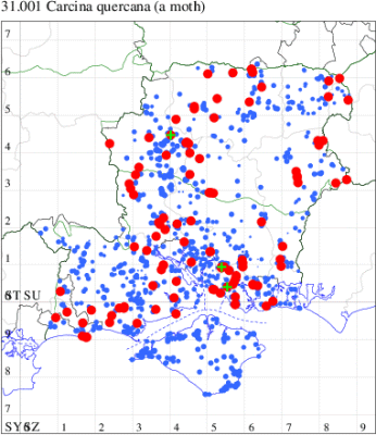 For the maps, all records prior to 2023 are shown by a blue dot (the larger the dot, the more recent), with the current year's records shown in red. As previous records are superimposed on any report for 2023, new sites have greater emphasis (i.e. will show as 'more red').