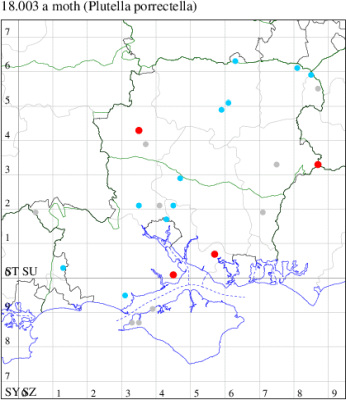 Common wherever the foodplant occurs, throughout the British Isles. In Hampshire the foodplant is local and so is the moth; there are only a very few records from the Isle of Wight. Wingspan 14-17 mm. Similar to Diamond-back Moth P. xylostella but slightly larger and more striated, and with three darkish rings on tip of antennae (MBGBI Vol 3). Larva feeds on Dame's-violet, beneath a silken web, often several together.