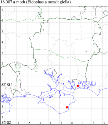 Local on waste ground throughout much of southern England and Wales, north to Lancashire. In Hampshire, recorded very frequently on an annual basis in the Portsmouth area, with a few localised records from the 1990s in the north of the county. First recorded from the Isle of Wight in 2014 at Shanklin, where it has occurred again in recent years. Wingspan 14-16 mm. Bold cream stripe across centre of forewing and two pale rings on tip of dark antennae are characteristic of this fairly distinctive species. Larva feeds on Hoary Cress.