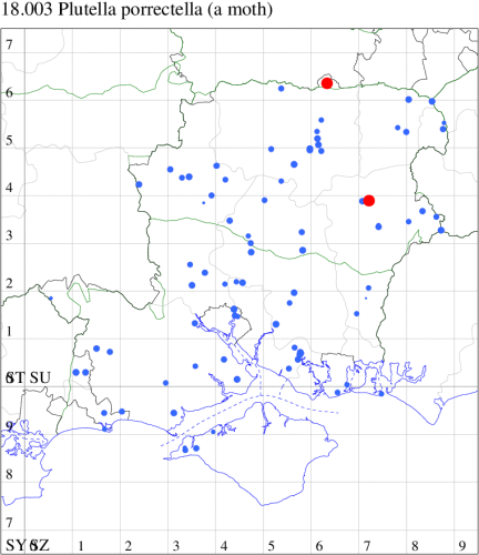 Common wherever the foodplant occurs, throughout the British Isles. In Hampshire the foodplant is local and so is the moth; there are only a very few records from the Isle of Wight. Wingspan 14-17 mm. Similar to Diamond-back Moth P. xylostella but slightly larger and more striated, and with three darkish rings on tip of antennae (MBGBI Vol 3). Larva feeds on Dame's-violet, beneath a silken web, often several together.