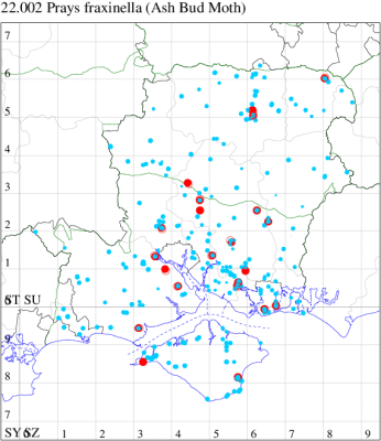For the maps, all records prior to 2020 are shown by a blue dot (the larger the dot, the more recent), with the current year's records shown in red. As previous records are superimposed on any report for 2020, new sites have greater emphasis (i.e. will show as 'more red').