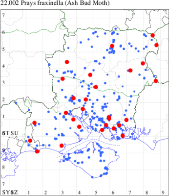 For the maps, all records prior to 2023 are shown by a blue dot (the larger the dot, the more recent), with the current year's records shown in red. As previous records are superimposed on any report for 2023, new sites have greater emphasis (i.e. will show as 'more red').